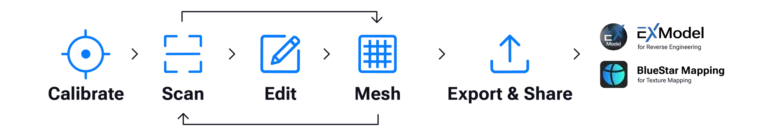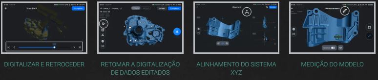 O aplicativo EinScan Rigil oferece suporte a fluxos de trabalho de digitalização completos no dispositivo, desde calibração, digitalização, modificação de dados, geração de superfície fechada, edição de modelo até exportação e compartilhamento.