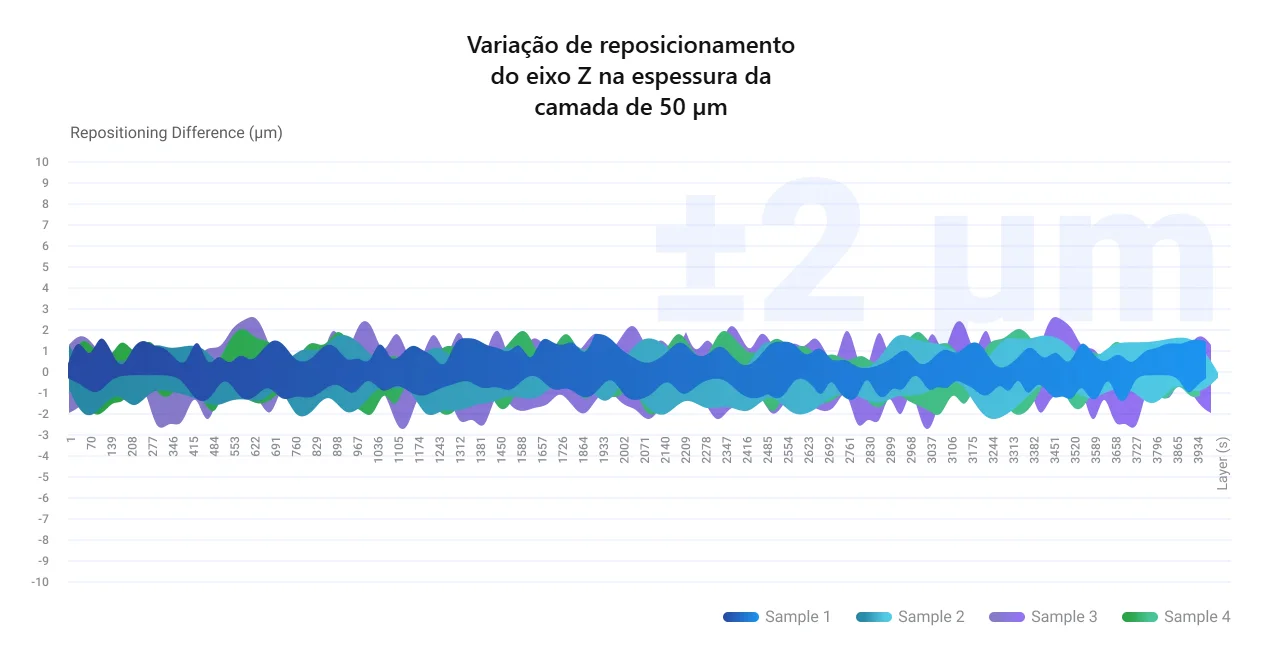 * Dados obtidos do HeyGears Lab, 96% dos erros de movimento estão dentro de 1 μm, e 99,9% dos erros não ultrapassam 2 μm.